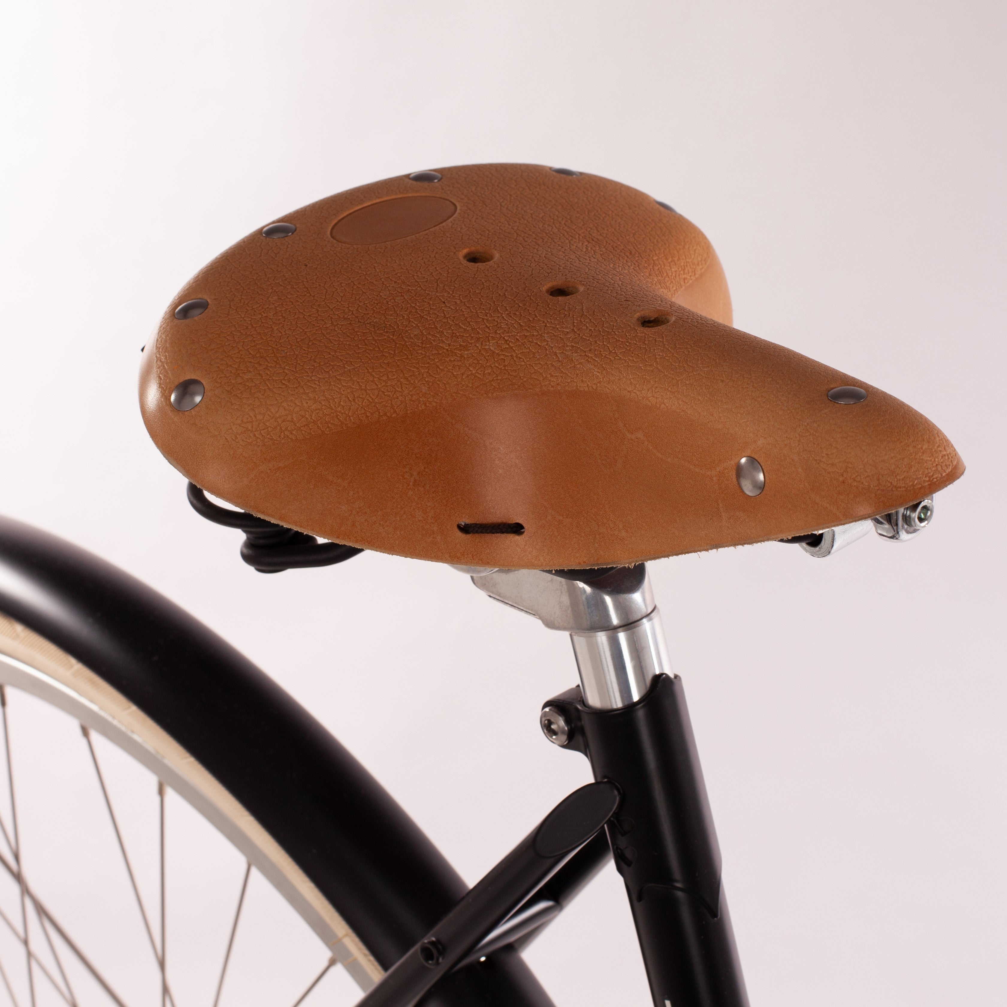 Der bequeme, gefederte Ledersattel, die ergonomischen Griffe und der geschwungene Lenker bieten hohen Fahrkomfort. Der stabile Seitenständer rundet das Gesamtpaket ab – ein Citybike, das sowohl optisch als auch funktional überzeugt.